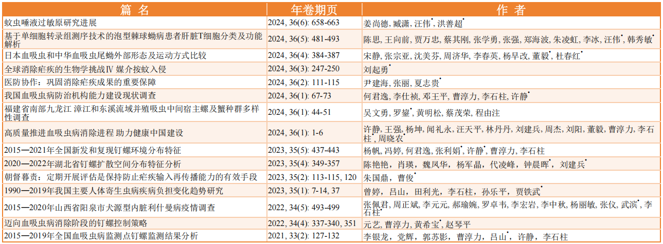 近期,国家科技部中国科学技术信息研究所(中信所)发布了2025年“领跑者5000——中国精品科技期刊顶尖学术论文”(Frontrunner 5000,简称F5000)入选论文名单,《中国血吸虫病防治杂志(中英文)》共有15篇论文入选,期刊学术影响力再获肯定!