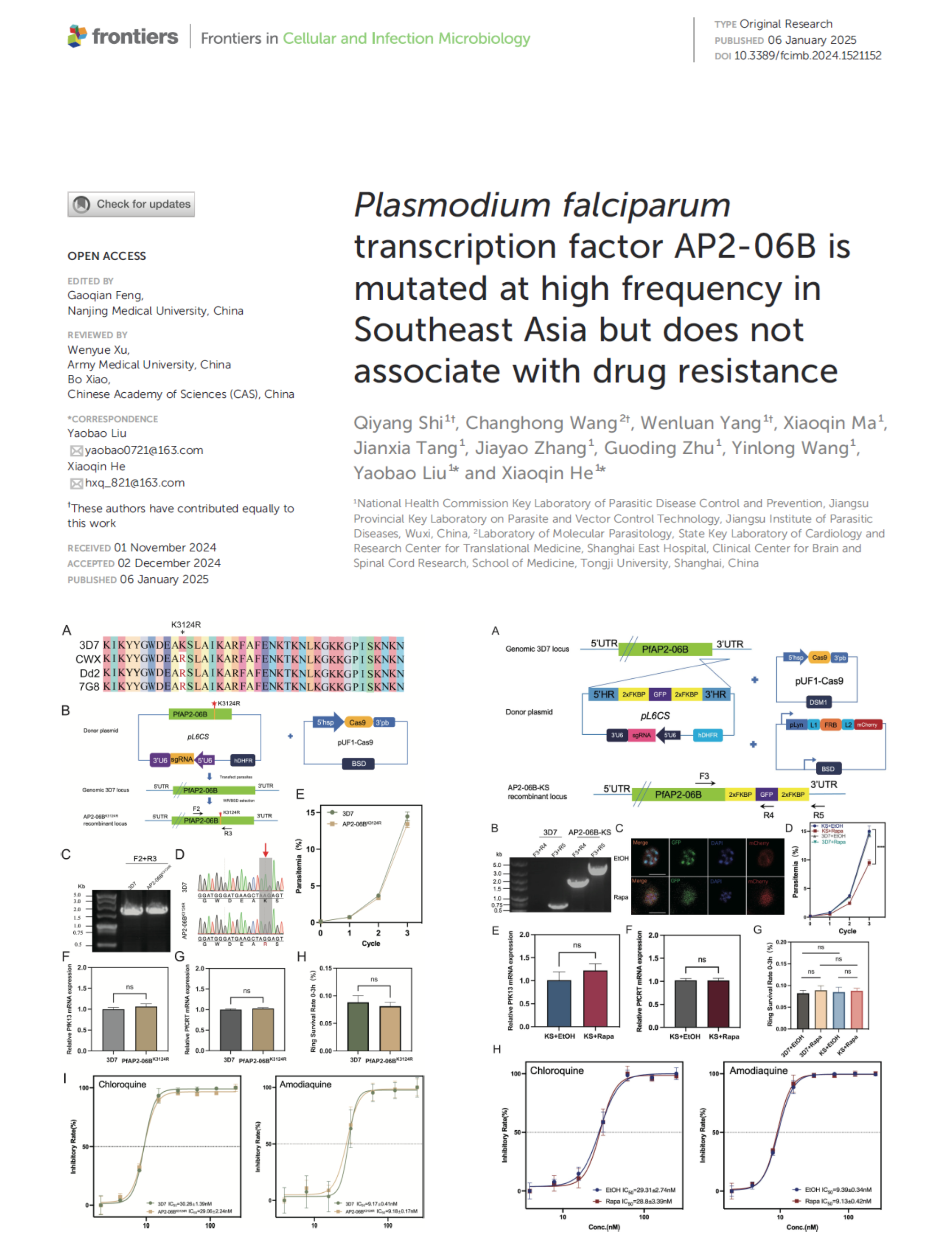 恶性疟原虫的耐药性是目前疟疾防控面临的最大挑战。AP2作为疟原虫的转录因子,调控疟原虫生长发育的各个阶段,包括耐药性。然而,AP2在疟原虫耐药性中的调节作用尚不清楚。通过对AP2家族进行SNP筛选,结果显示AP2-06B (PF3D7_0613800,命名为AP2-06B)有6个等位基因频率大于0.05的非同义突变,其中K3124R位于PfAP2-06B的结构域。同时,ChIP-Seq结果显示AP2-06B可以结合pfk13和pfcrt的位点。在青蒿素耐药虫株CWX和氯喹耐药菌株Dd2和7G8中也发现了AP2-06B的K3124R突变,这提示AP2-06B可能通过调节pfk13和pfcrt的表达来调控疟原虫对青蒿素和喹啉的耐药。为了进一步研究AP2-06B与疟原虫耐药之间的关系,我们构建了AP2-06B基因编辑寄生虫,并分析了它们对青蒿素和喹啉类抗疟药的敏感性。然而无论是AP2-06B的K3124R突变还是AP2-06B的条件性敲低,都不能通过调节pfk13或pfcrt的表达来影响疟原虫对青蒿素或喹啉类药物的敏感性。以上结果提示,AP2-06B突变K3124R或条件敲除后未观察到耐药性变化。考虑到抗性的多基因性质,可能很难通过一个基因重建抗性表型。综上所述,AP2-06B是否调控了青蒿素耐药或喹啉耐药仍有待进一步研究。