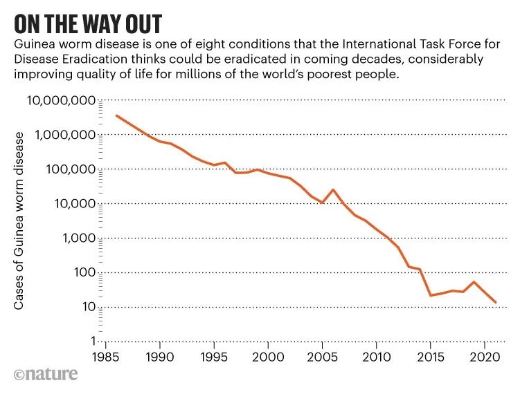 与2020年报告的27例病例相比,病例减少了近50%,这是国际组织和流行国家近40年来努力消除麦地那龙线虫病的成果。而就在20世纪80年代,该病广泛分布于20多个国家,每年有约350万人被感染。然而,也有专家认为,动物宿主的存在意味着根除可能还需要一段时间。如果成功根除这种寄生虫病,这将与天花和牛瘟一起成为人类历史上被有目的地根除的疾病。