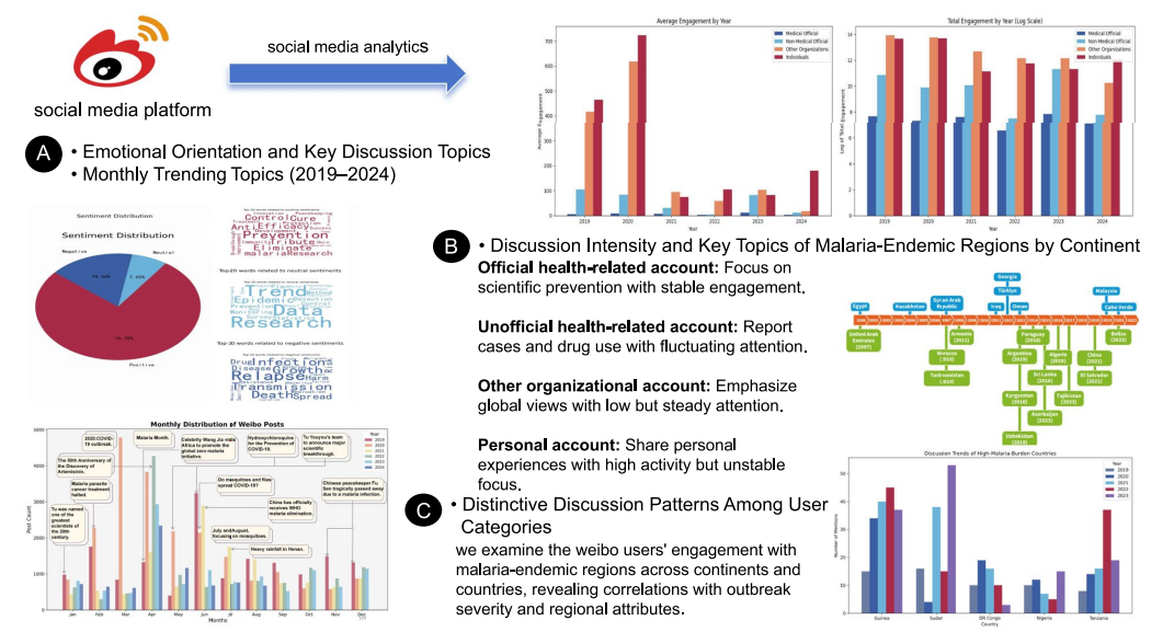 该研究于 2019 年 1 月至 2024 年 8 月期间在新浪微博收集到 81010 条疟疾相关帖子,分析发现网民对疟疾的关注呈事件驱动特征,在我国对非卫生援助、公共卫生事件及世界 / 中国疟疾日前后达到高峰,且负面事件引发的参与时长约为正面事件的 1.5 倍;区域讨论上,涉非内容虽略有下降但仍占年度区域特定帖子的 60% 以上,而涉亚、美话题较分散;不同类型账号讨论重点各异,官方卫生类账号侧重疟疾预防但发帖量少,个人账号更关注治疗与健康经历分享,非官方卫生类账号话题分布均衡且重视疫苗与科研,组织类账号则提供疟疾防控机构信息。