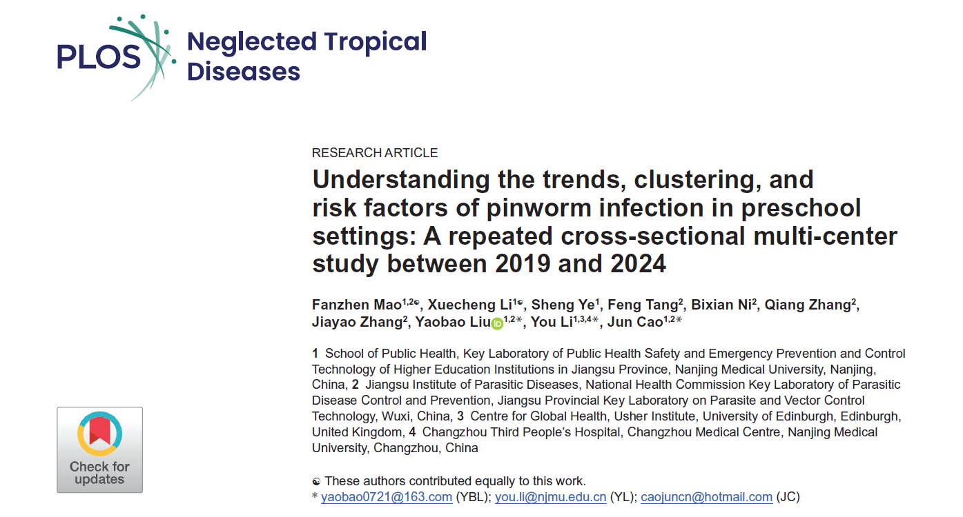 近日,江苏省血吸虫病防治研究所在国际知名期刊《PLOS Neglected Tropical Diseases》发表了题为“Understanding the trends, clustering, and risk factors of pinworm infection in preschool settings: A repeated cross-sectional multi-center study between 2019 and 2024”的研究性论著,对江苏省 45个 县(市、区)104 所幼儿园、近 2.8 万名 2–7 岁儿童开展的重复横断面调查。