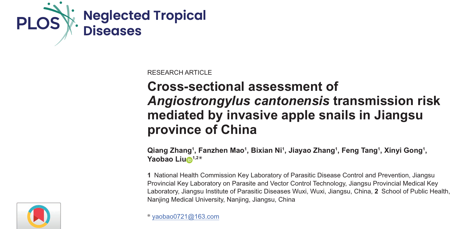 近日,江苏省血吸虫病防治研究所在国际知名期刊《PLOS Neglected Tropical Diseases》上发表了题为《Cross-sectional assessment of Angiostrongylus cantonensis transmission risk mediated by invasive apple snails in Jiangsu province of China》的研究性论著。该研究通过对现场螺体检测与居民知识—态度—行为(KAP)调查相结合的方式,系统评估了江苏省入侵福寿螺传播广州管圆线虫的潜在风险,为科学防控提供了重要依据。