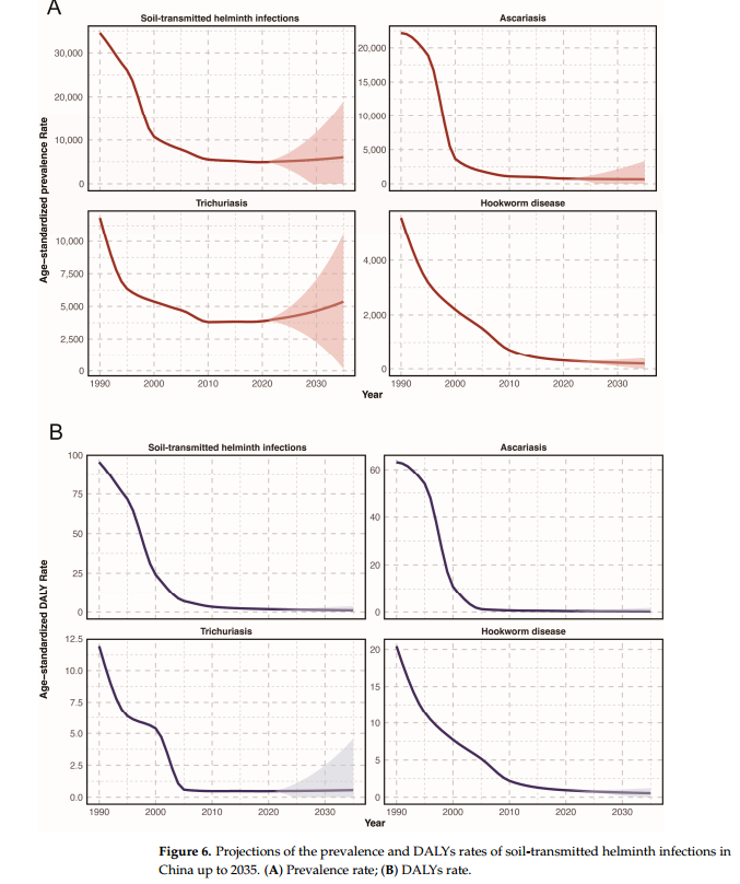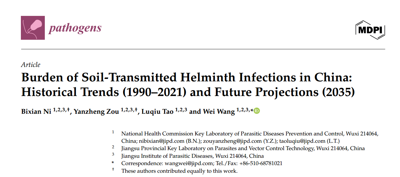 近日,我所研究人员在国际同行评议期刊《Pathogens》上发表题为《Burden of soil-transmitted helminth infections in China: Historical Trends (1990-2021) and Future Projections (2035)》的研究性论文,全面评估了1990—2021年我国土源性线虫病疾病负担,并预测其至2035年的变化趋势。