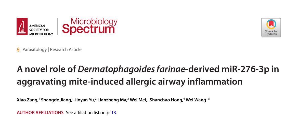 近日,我所联合江南大学附属中心医院在Microbiology Spectrum(中科院二区,IF = 3.8)发表研究性论文《A novel role of Dermatophagoides farinae-derived miR-276-3p in aggravating mite-induced allergic airway inflammation》,通过体内、体外实验揭示了粉尘螨来源dfa-miR-276-3p在过敏性气道炎症中的作用及其机制。