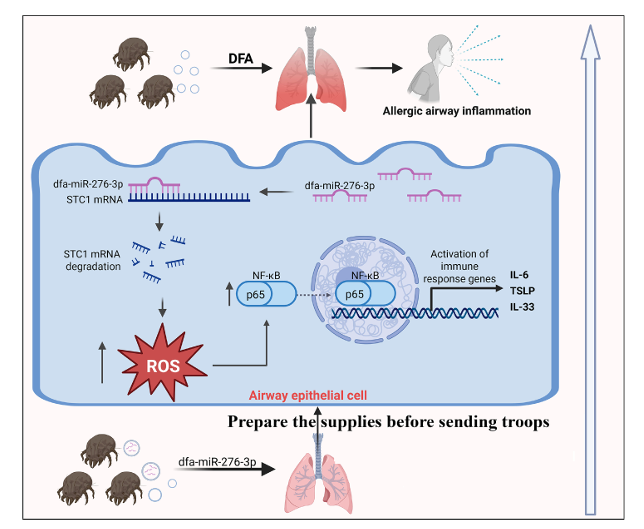 该研究使用AAV-dfa-miR-276-3p构建肺部dfa-miR-276-3p过表达小鼠模型,证实dfa-miR-276-3p可加重粉尘螨提取物(DFE)诱导的小鼠气道炎症。体外细胞实验证实dfa-miR-276-3p通过靶向调控斯钙素1(STC1)激活活性氧(ROS)/核因子κB(NF-κB)通路,加重DFE诱导的人支气管上皮BEAS-2B细胞炎症反应;添加重组人STC1后减轻dfa-miR-276-3p的促炎效应,抑制ROS/NF-κB信号通路。小鼠模型研究进一步证实,dfa-miR-276-3p通过STC1调控ROS/NF-κB通路驱动DFE诱导的气道炎症。该研究揭示了DFA来源miRNA在过敏性哮喘发病机制中的跨物种调控作用,明确dfa-miR-276-3p是DFA诱导过敏性气道炎症的关键启动因子,有望为后续过敏性哮喘防治提供新的干预靶点。
