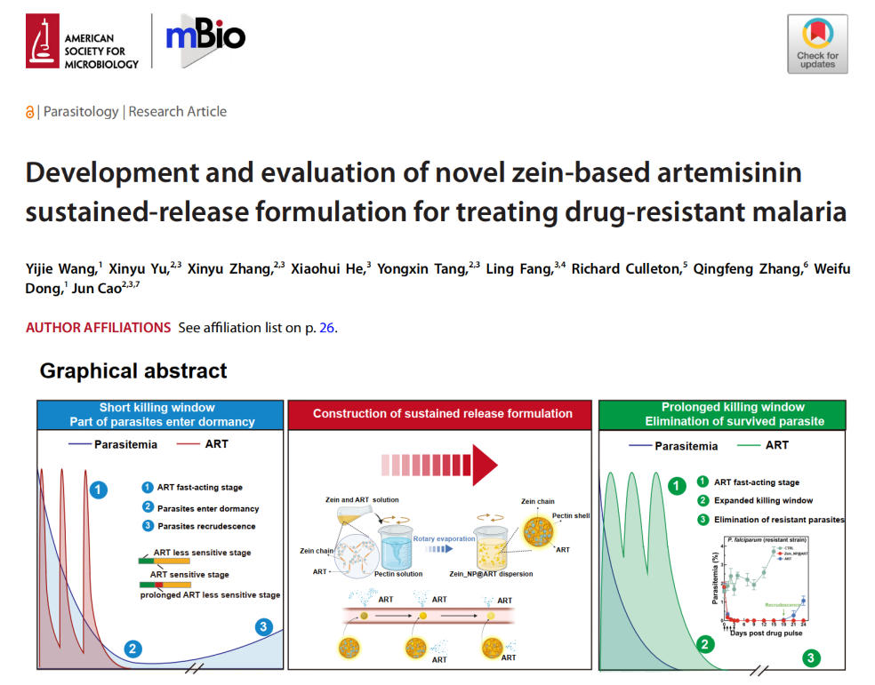 2026年1月12日,江苏省血吸虫病防治研究所曹俊/江南大学化学与材料工程学院东为富/同济大学医学院张青锋课题组合作在美国微生物学会旗下mBio期刊上发表了题为 “Development and evaluation of novel zein-based artemisinin sustained-release formulation for treating drug-resistant malaria” 的研究性论著,该研究将青蒿素负载于生物相容性优良的玉米醇溶蛋白(zein)纳米载体,通过调控载体结构与药物负载方式,显著改善了青蒿素的水溶性与体外储存稳定性,为利用剂型改善策略解决青蒿素类药物临床应用瓶颈、应对疟原虫耐药性难题提供了实验依据。
